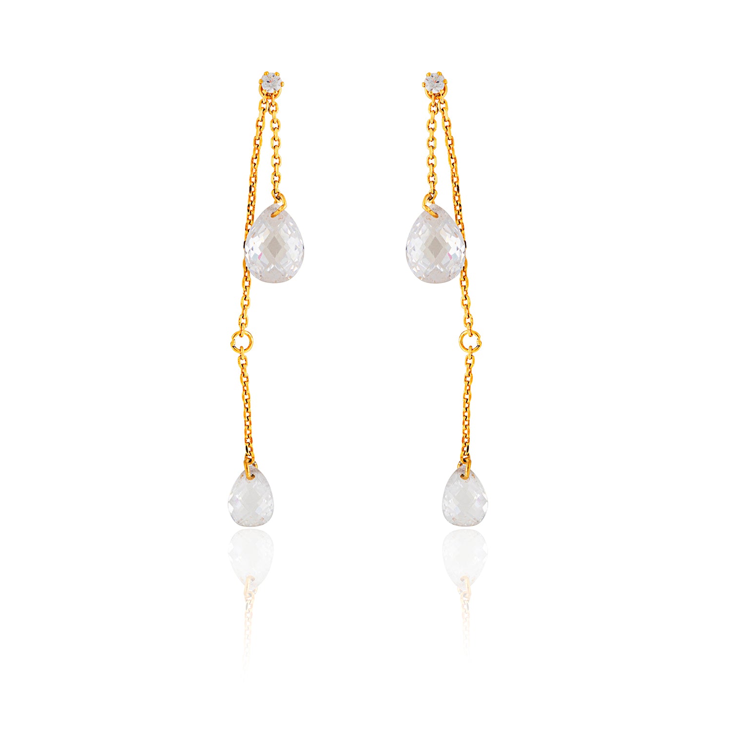 Two faceted crystal teardrops dangle from delicate gold chains — and the best part? You can shorten them using the upper hole for a customisable drop!