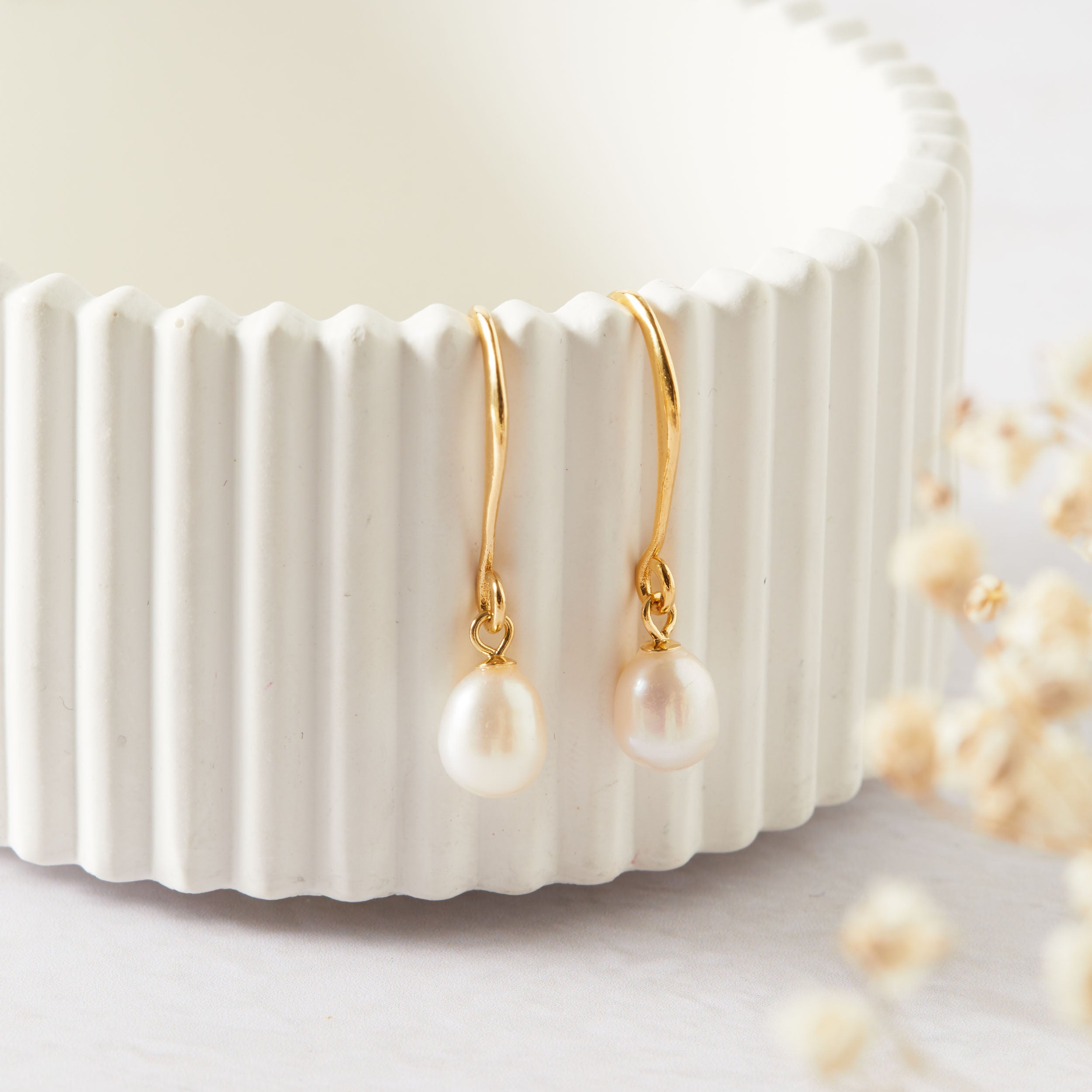 Crafted in luxurious 18k gold, each earring features a luminous pearl suspended from a sleek 18k-gold-plated sterling silver base hook. The pearls' soft lustre and perfectly imperfect shapes lend an organic charm to these timeless beauties.
