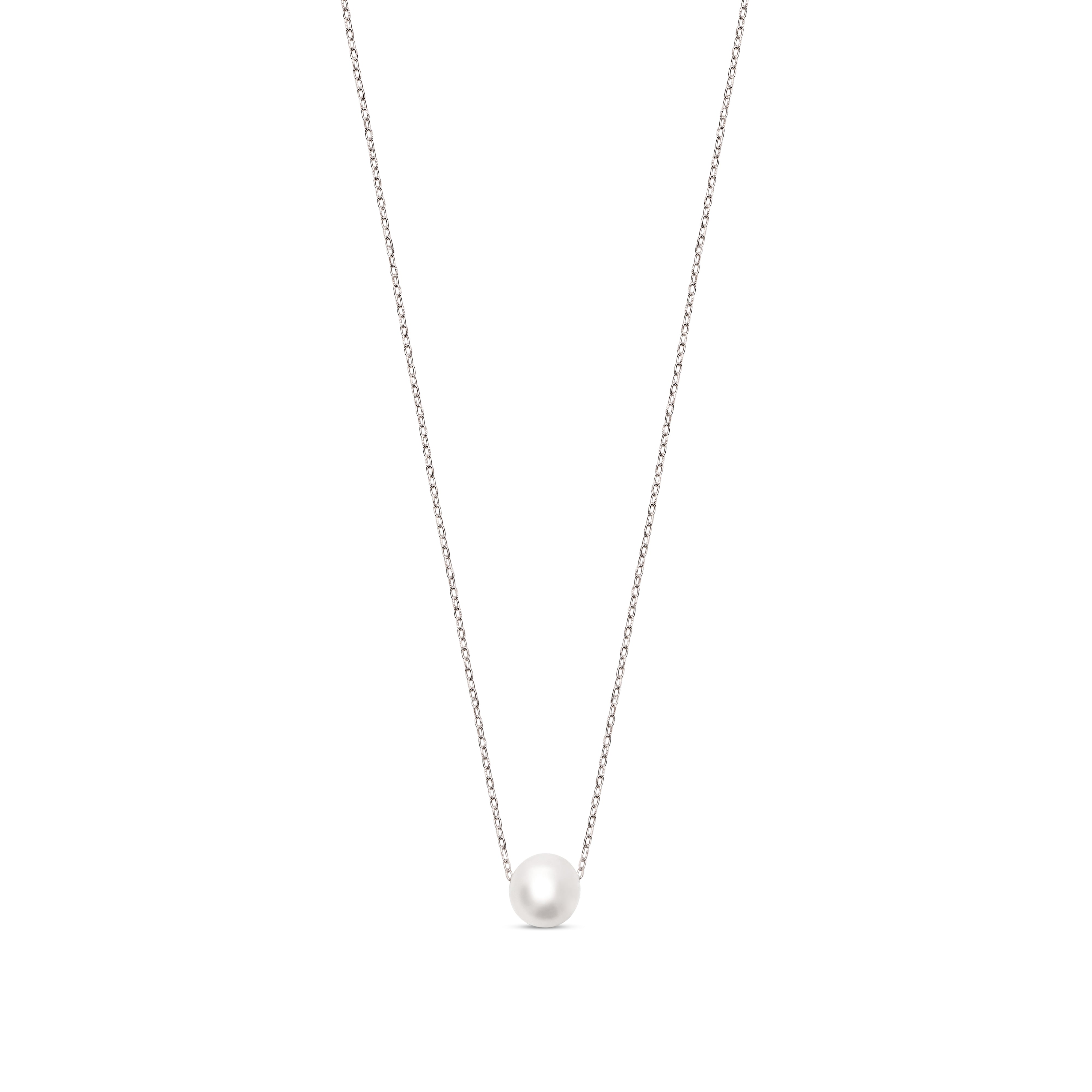 By threading the dainty silver chain directly through the pearl, we’ve eliminated the need for a traditional bail, resulting in a clean, uninterrupted silhouette.