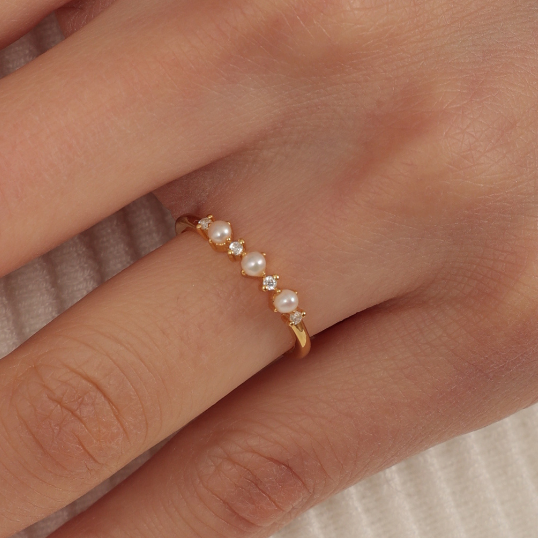Tiny real pearls and CZ stones sit along a slim gold band, catching the light in the most effortless way.