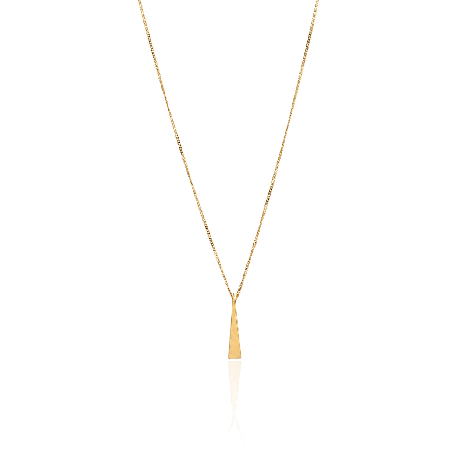 The delicate triangle tapers into a fine point, creating a sleek vertical drop that elongates the neckline with a polished, golden glow. Suspended from a dainty gold chain, it is a timeless piece designed for those who love clean lines and understated detail.