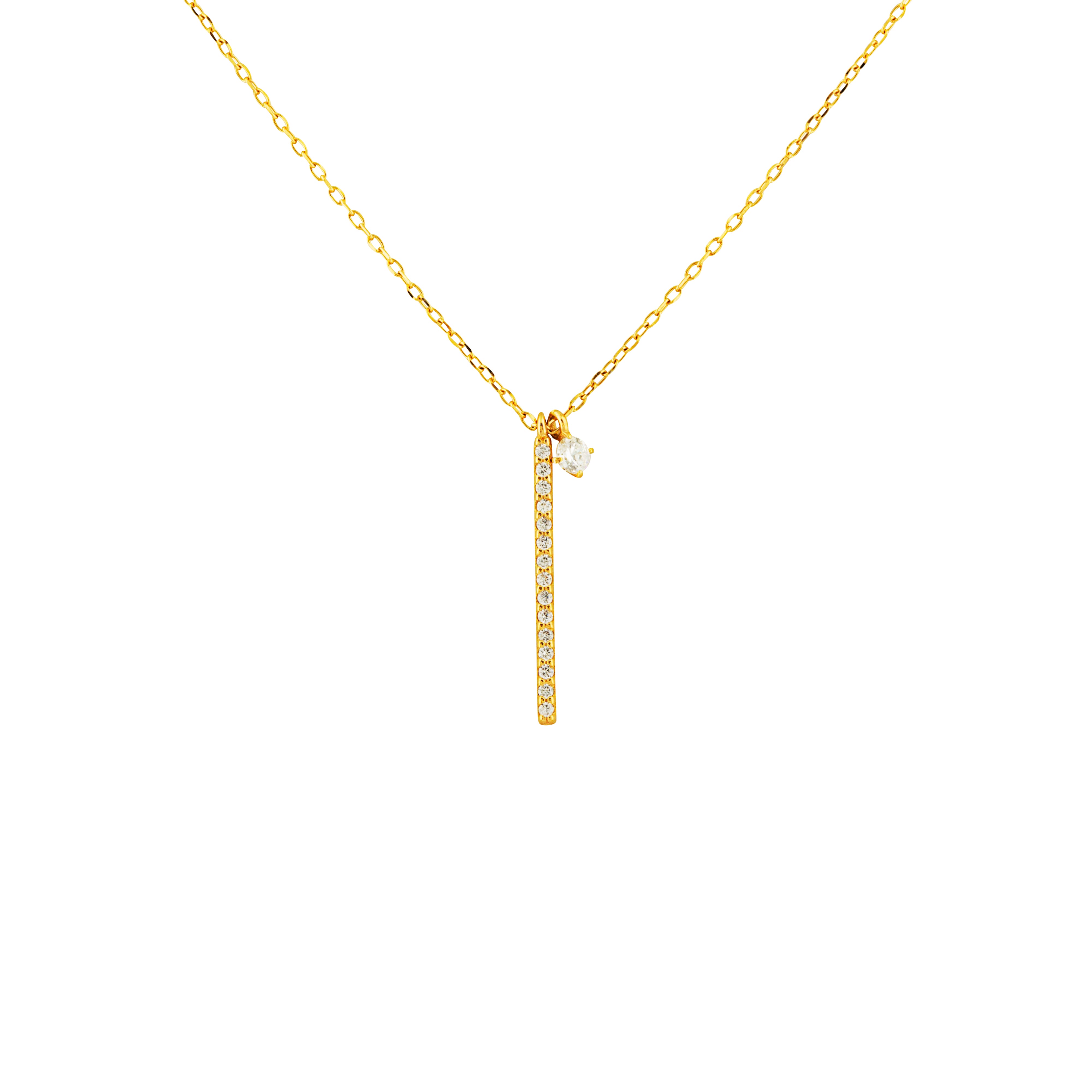 A simple drop necklace designed to sit naturally on the body. This piece features a fine chain with a slim vertical bar set with small cubic zirconia stones. The subtle drop creates a clean line at the neckline, adding detail without drawing too much attention. Lightweight and easy to wear, it works well on its own or layered with shorter chains.